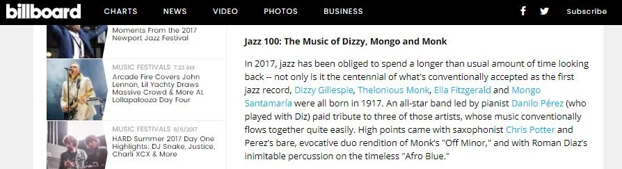 "Inside the fort, a hard-hitting ensemble directed by pianist Danilo Pérez performed Quincy Jones’ 'Jessica’s Day' and Dizzy Gillespie’s 'Cubano Be, Cubano Bop,' with strong solos by trumpeter Avishai Cohen, tenor saxophonist Chris Potter and conguero/vocalist Roman Díaz, after which Pérez played an amazing solo rendition of Thelonious Monk’s 'Pannonica' followed by a full-band, 7/4 treatment of Monk’s “Off Minor”, featuring a powerful extended solo from Potter, who was later joined by Pérez."